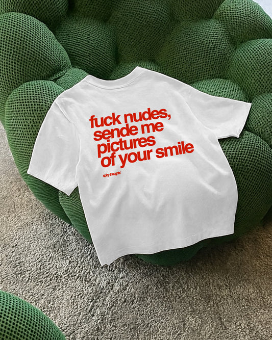 Heavy Oversized Tee - Fuck Nudes, Send Me Pictures of Your Smile