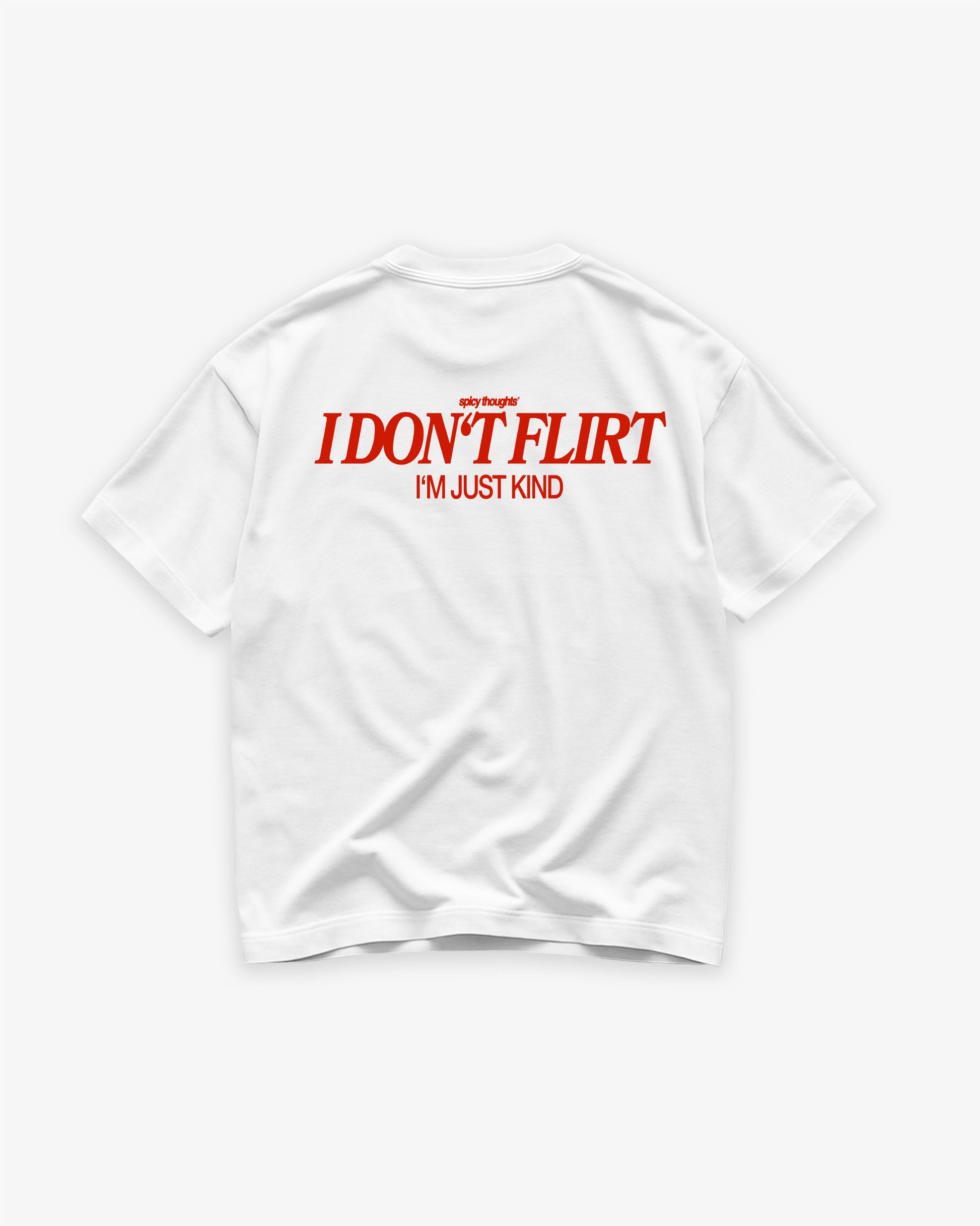This white tee with the bold red print “I DON’T FLIRT — I’M JUST KIND” is the perfect mix of humor, honesty, and social commentary.