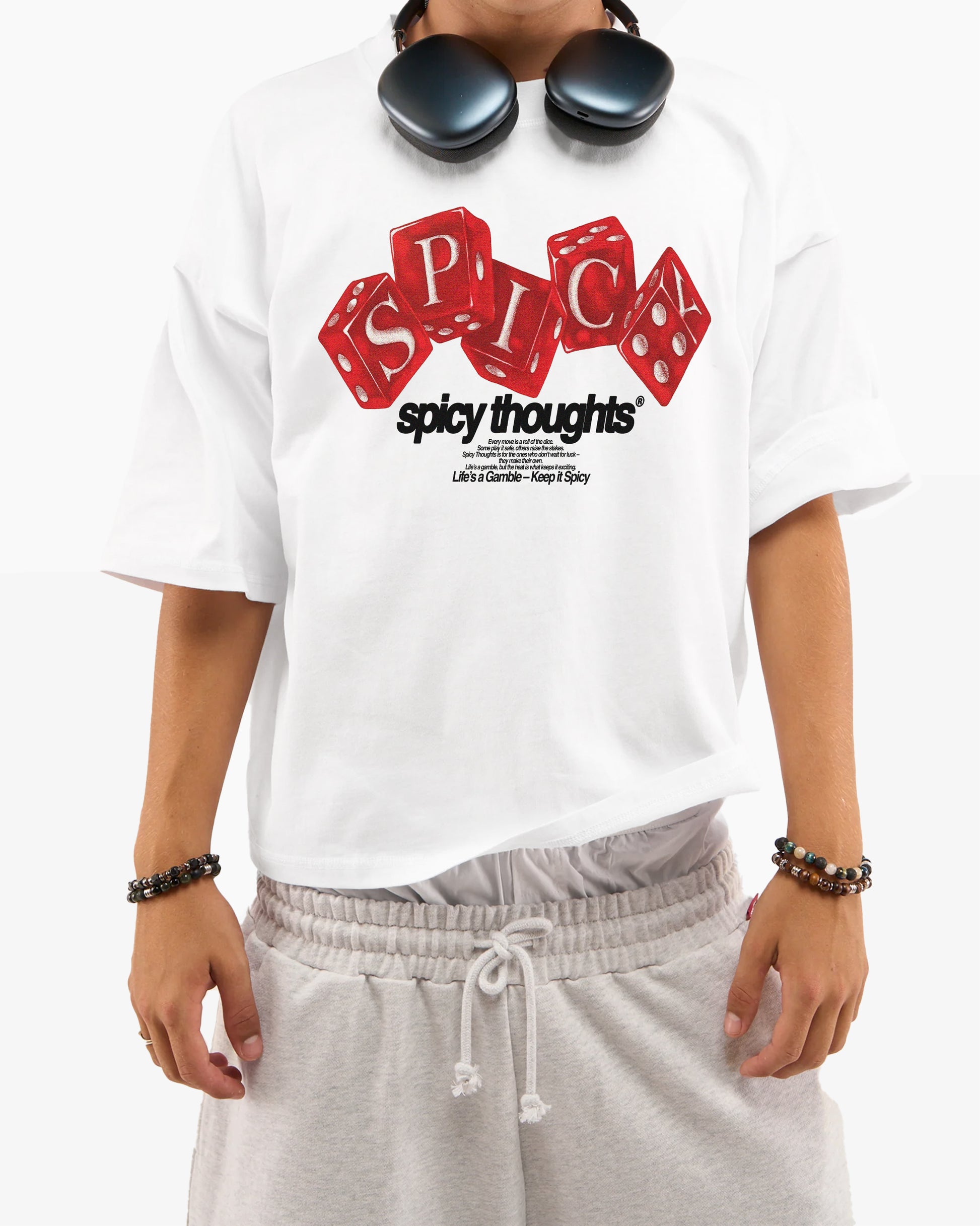 All in, every time. This tee plays with chance and attitude, featuring bold red dice that spell out SPICY across the chest. Underneath, the reminder hits: Life’s a Gamble – Keep it Spicy.