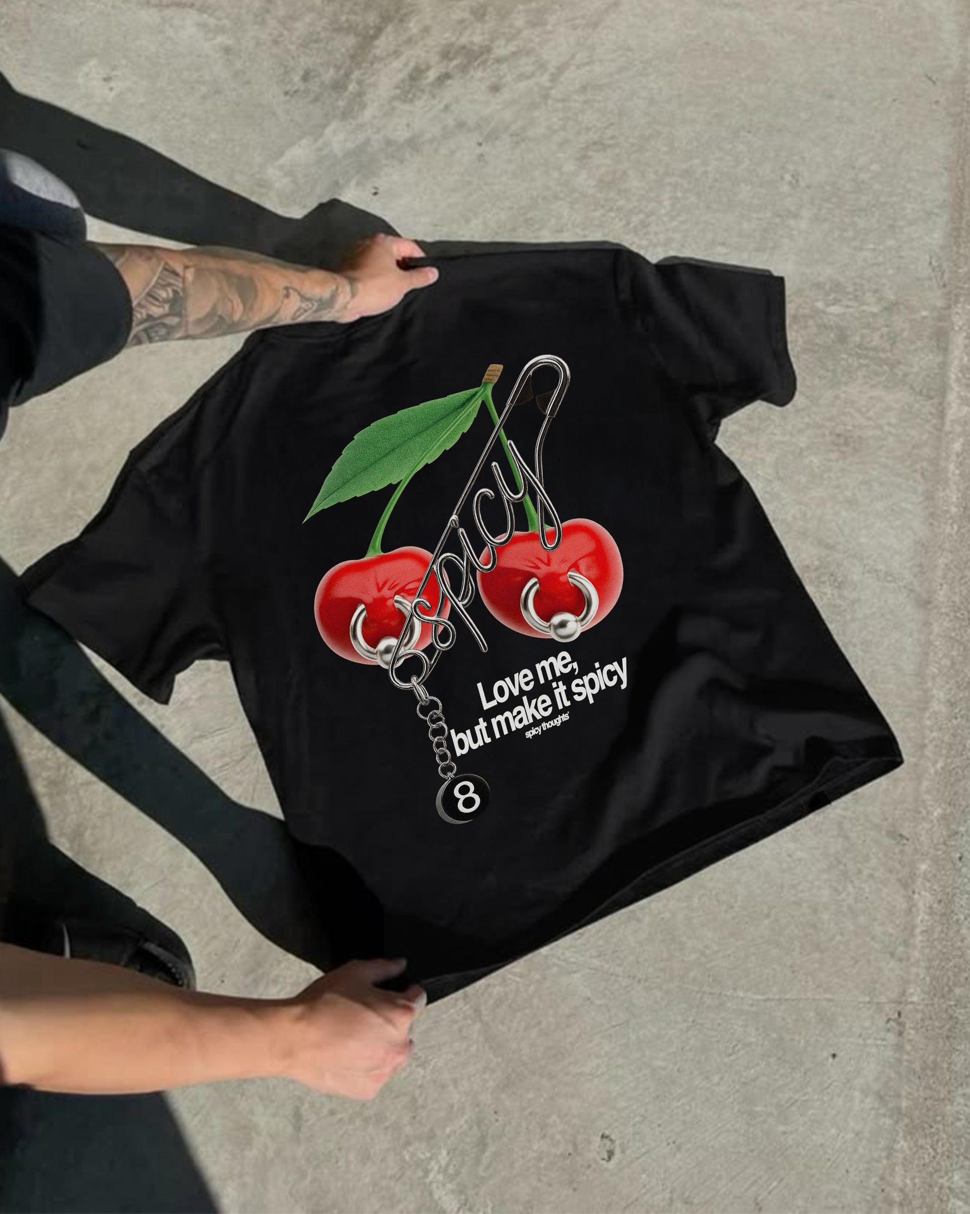 The “Love Me, But Make It Spicy” tee is bold, playful, and a little dangerous — just like you. Featuring a cherry graphic with metallic piercings and a safety pin script logo, this shirt brings that perfect mix of sweetness and edge.