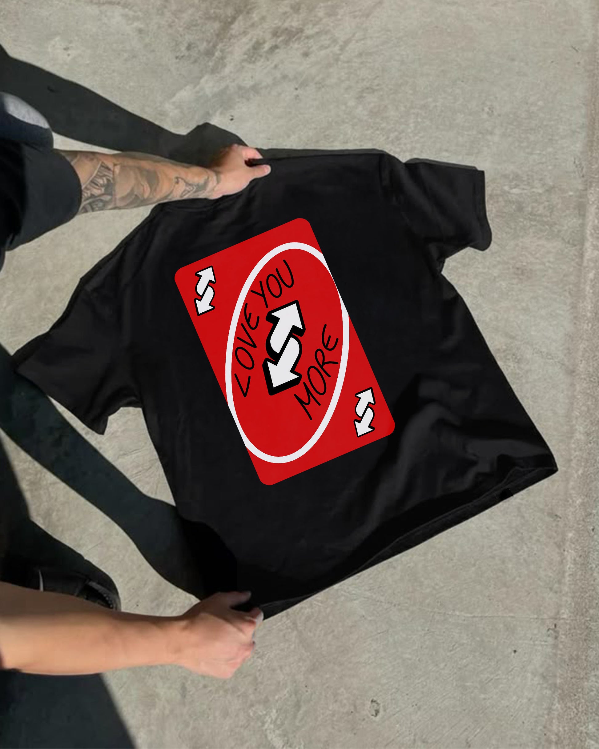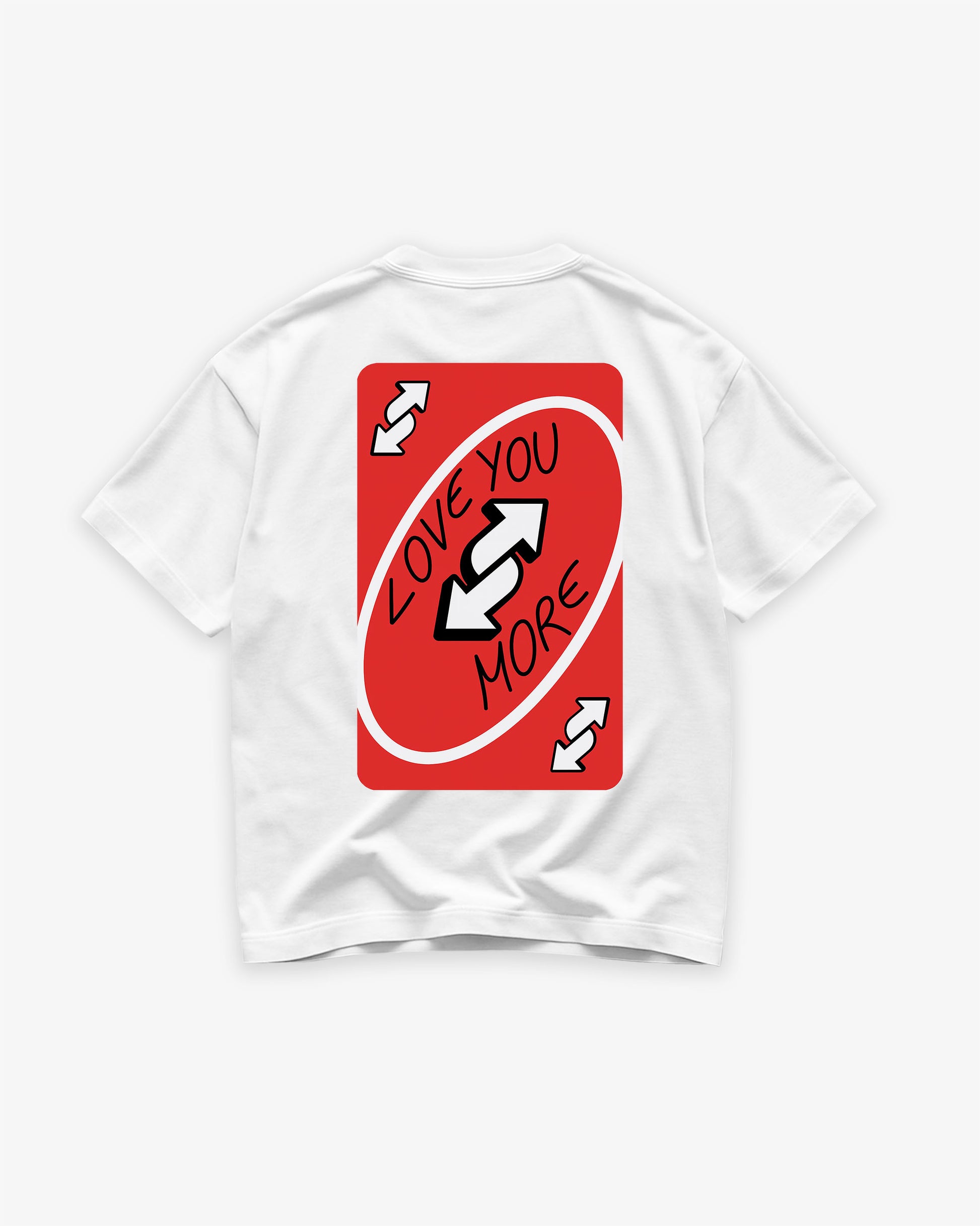 Der Love You More Tee von spicy thoughts® bringt deine Lieblingskarte ins echte Leben – reverse energy only. Inspiriert vom ikonischen UNO-Design, aber mit einem romantischen Twist. Für alle, die nie verlieren, wenn’s um Liebe geht.
