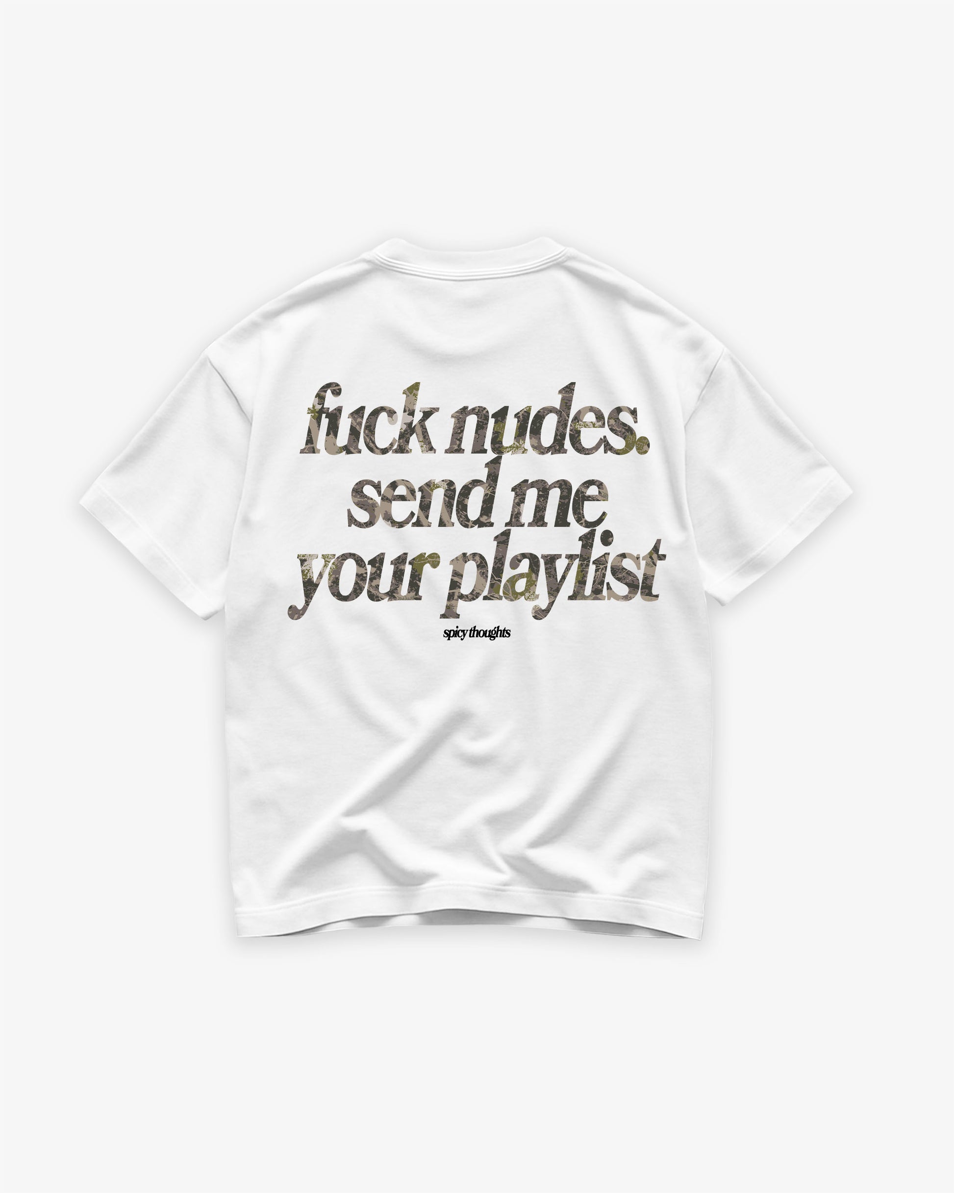 Das fuck nudes. send me your playlist Tee von spicy thoughts® ist ein Statement für alle, die wissen, dass echte Intimität in Beats steckt, nicht in Chats.