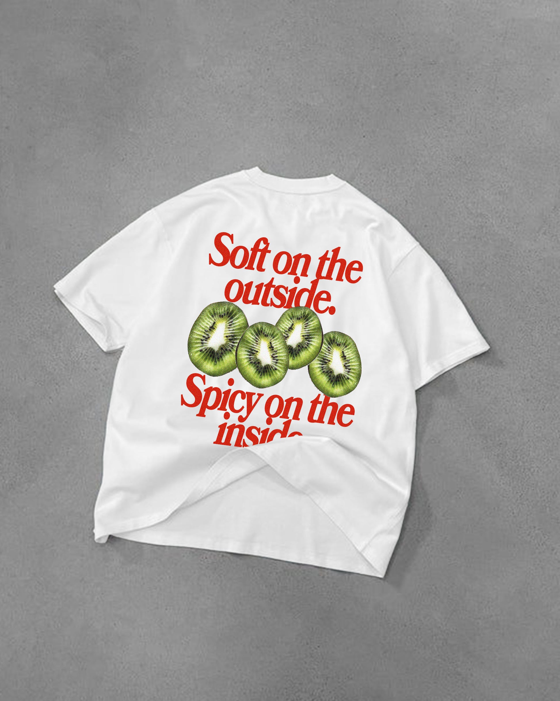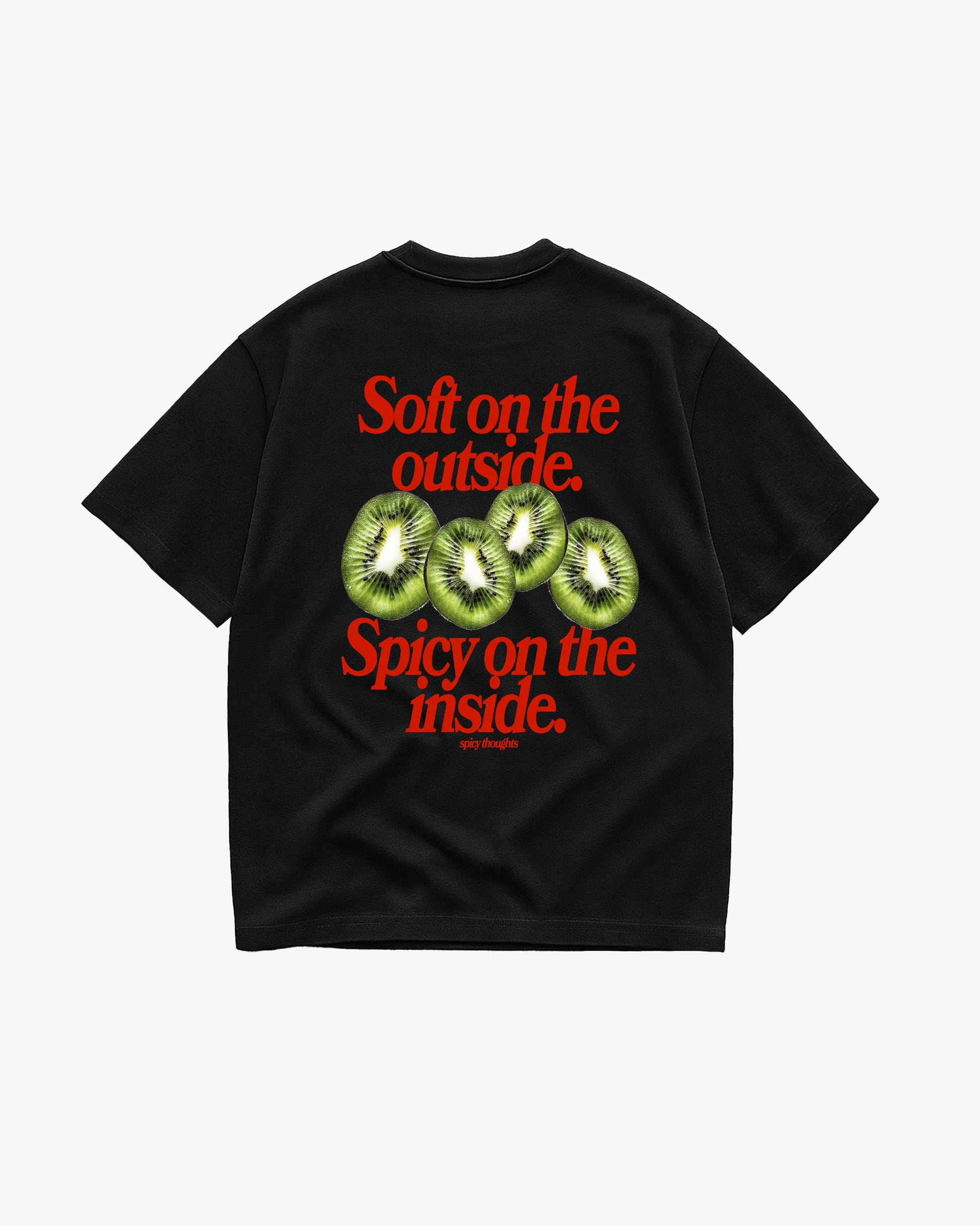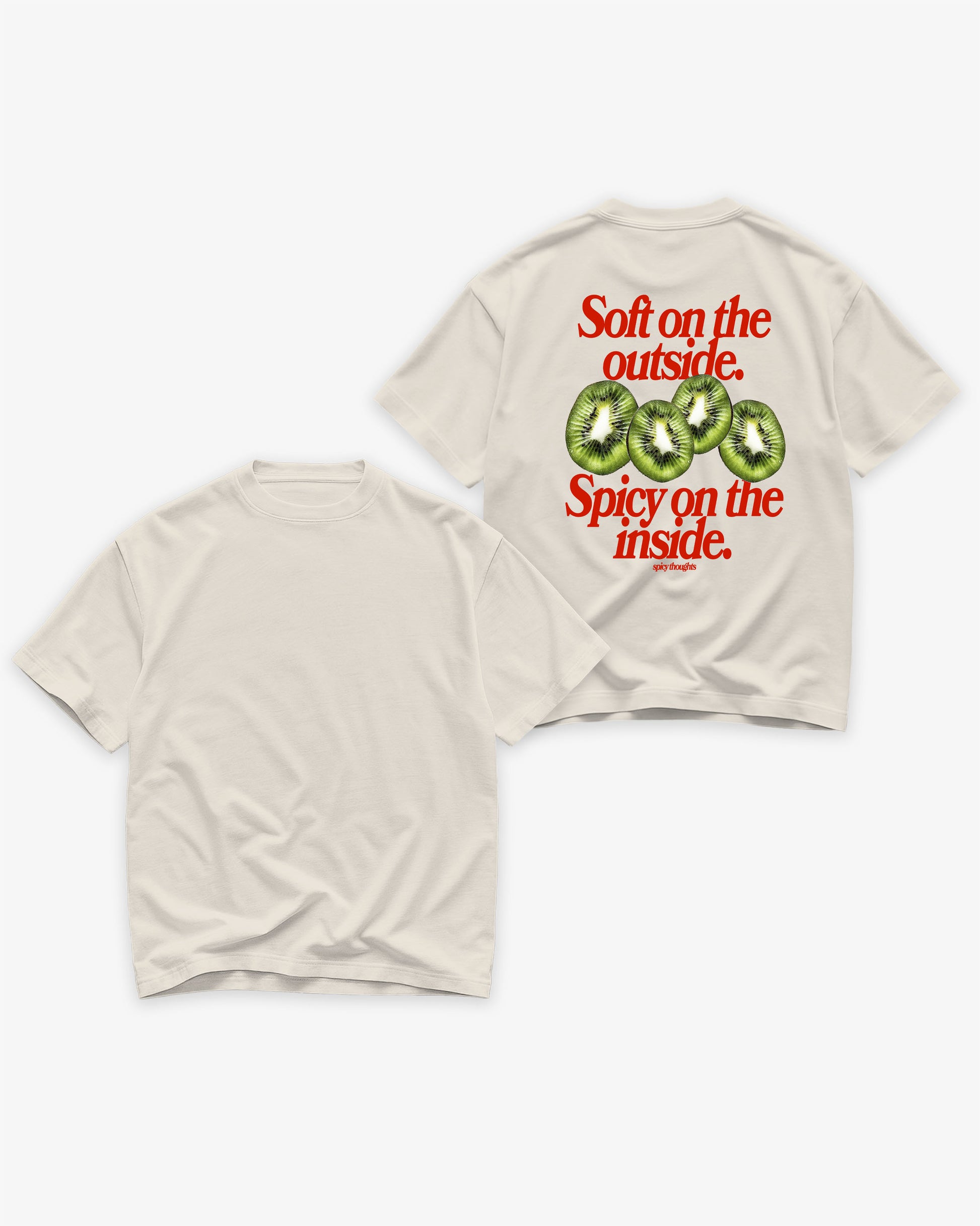 This tee is for the ones who stay soft but strike hard. A cluster of kiwis on the back says it all: tender vibes outside, spicy thoughts inside.