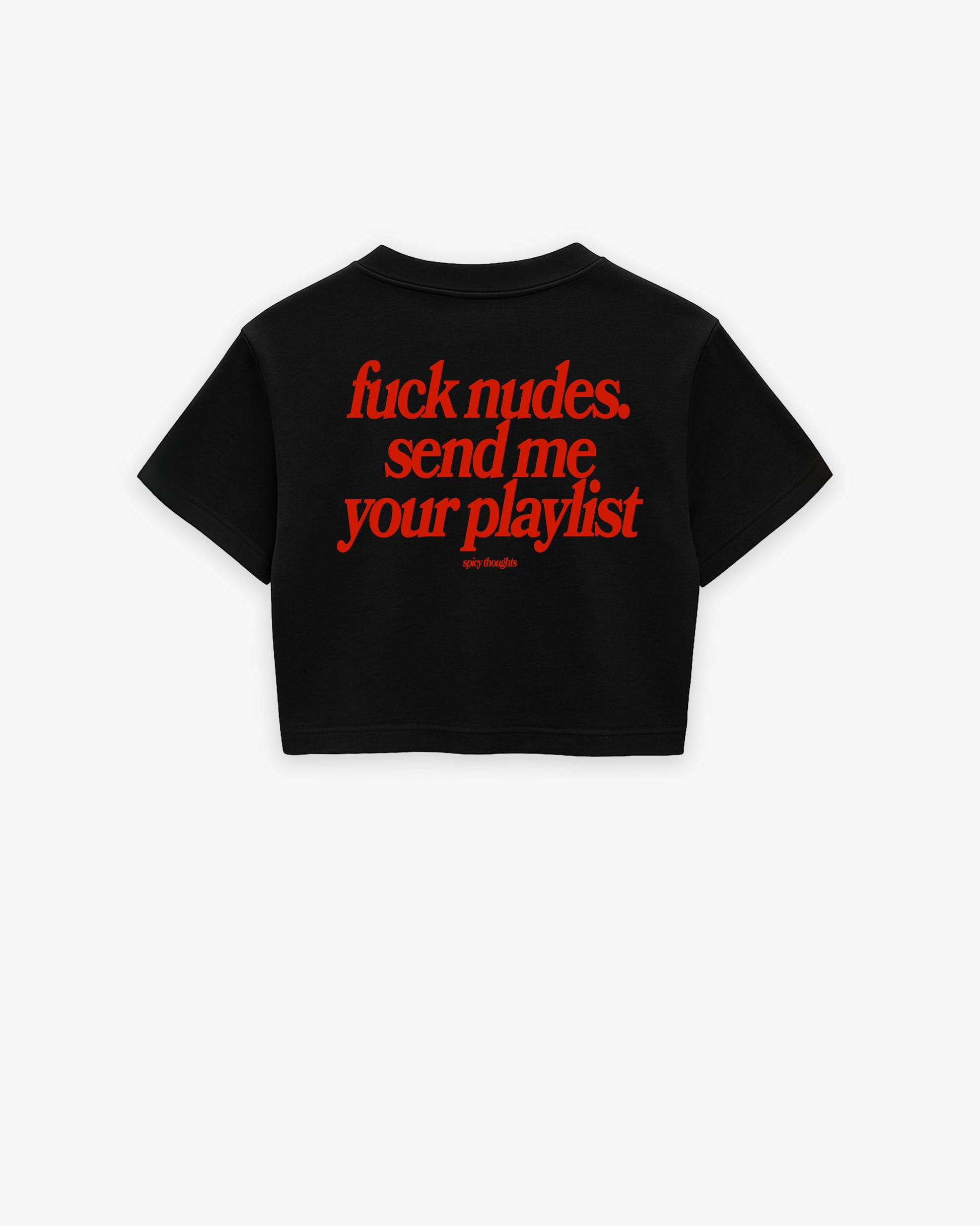 The “Fuck Nudes. Send Me Your Playlist” cropped tee says what everyone’s thinking but no one dares to say. Designed for the girls who flirt through music, not selfies.