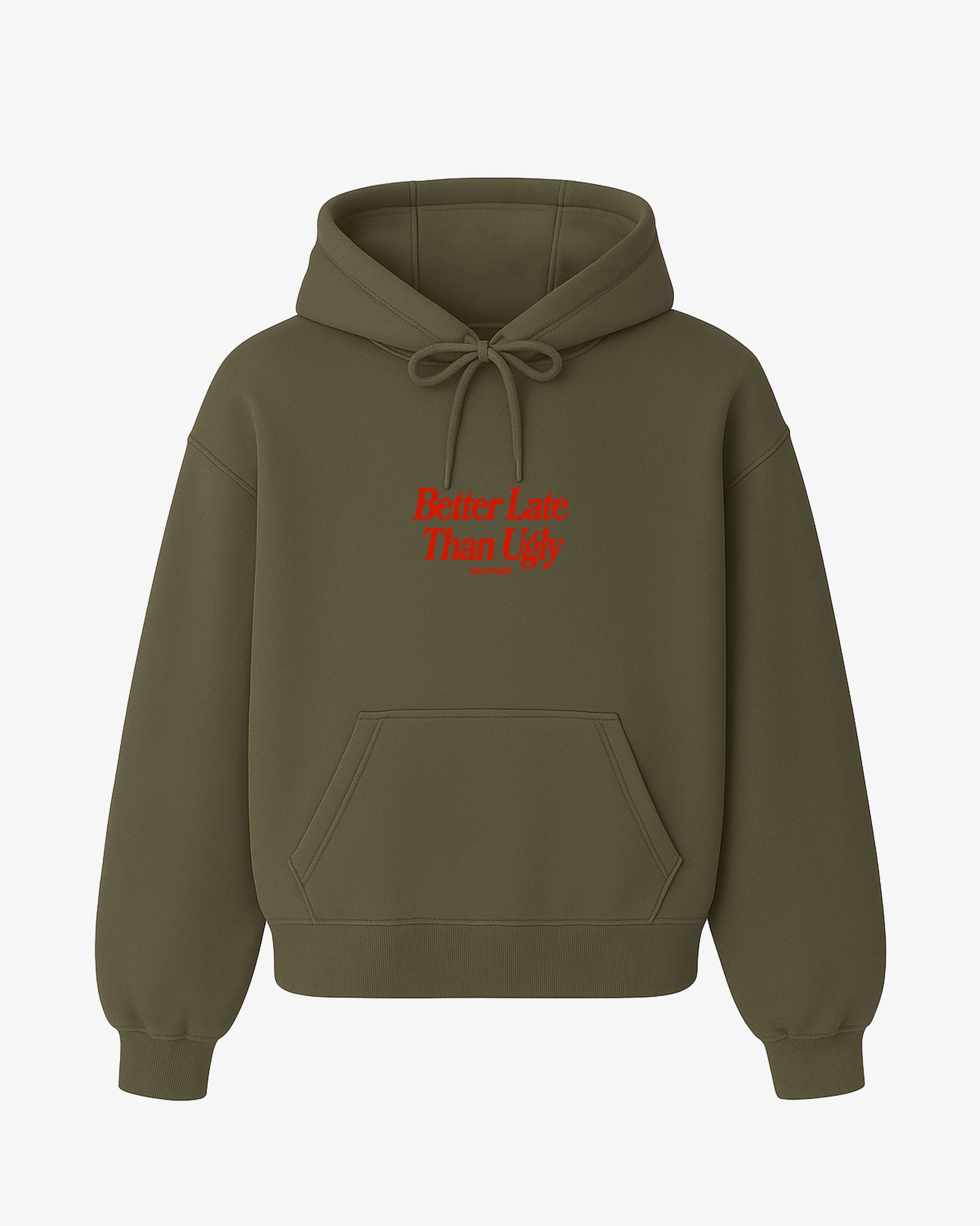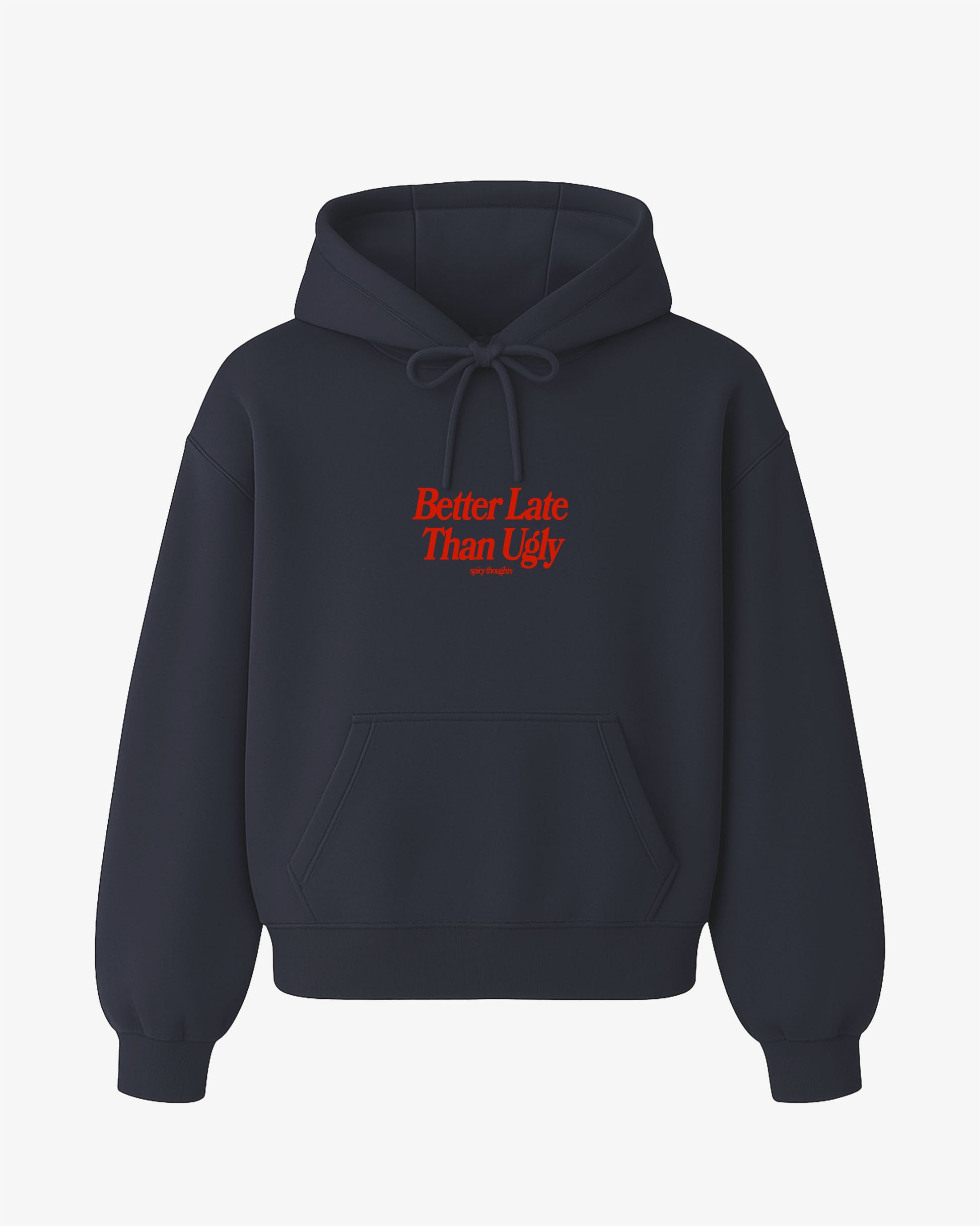 Der Better Late Than Ugly Hoodie von spicy thoughts® bringt Attitude in dein Outfit – perfekt für alle, die wissen, dass gutes Aussehen nie gehetzt werden sollte. Charmant, frech und einfach unapologetically you.