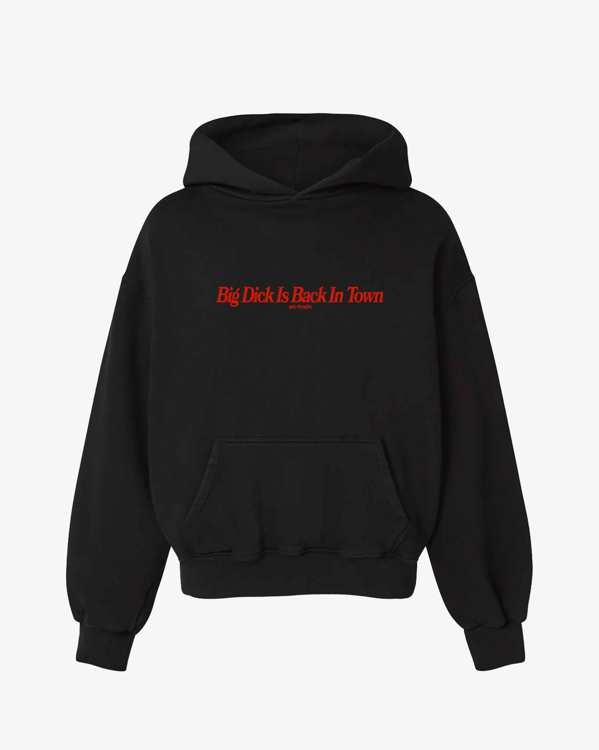 This black hoodie says what you were already thinking — Big Dick Is Back In Town, printed bold and red across the chest. Understated? Never. Unapologetic? Always.