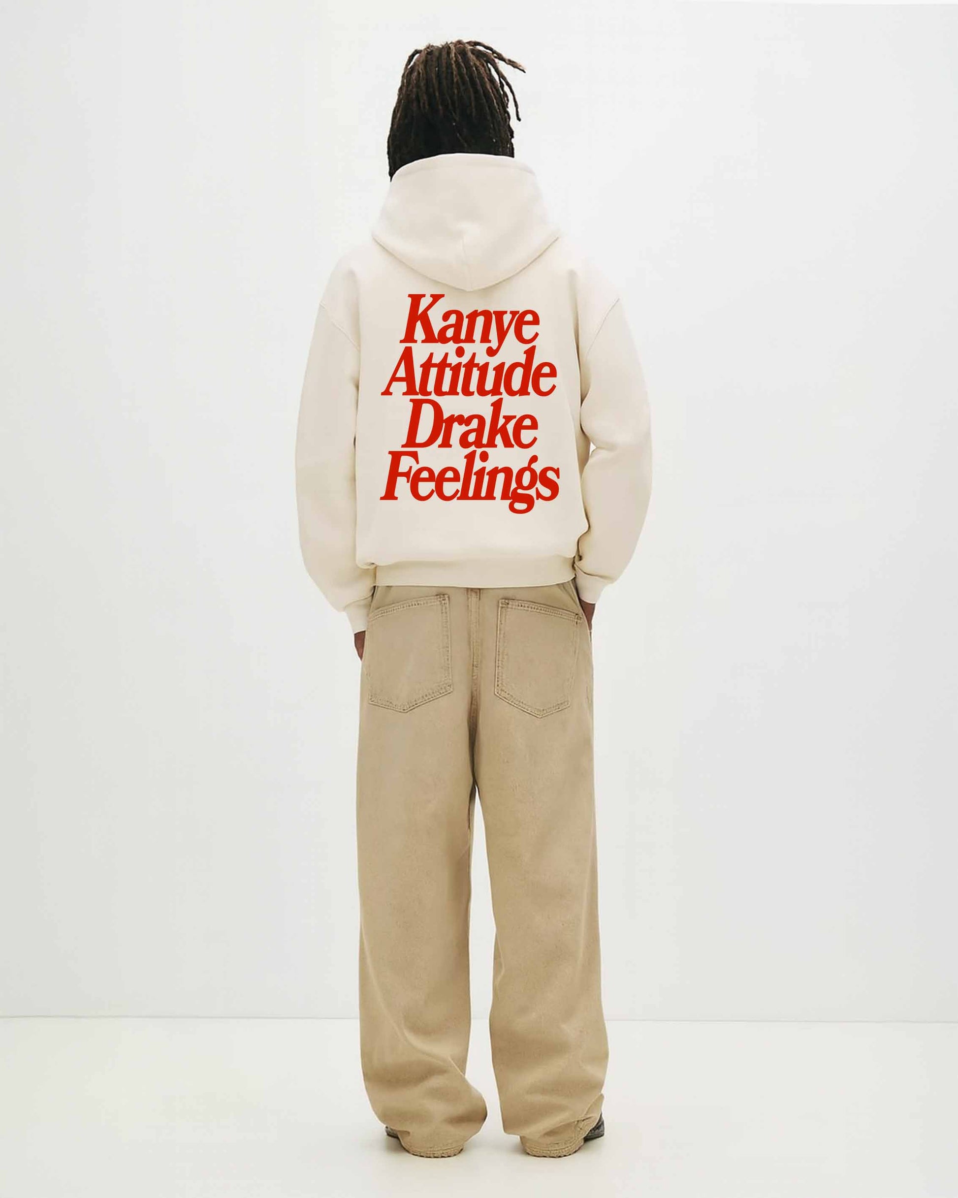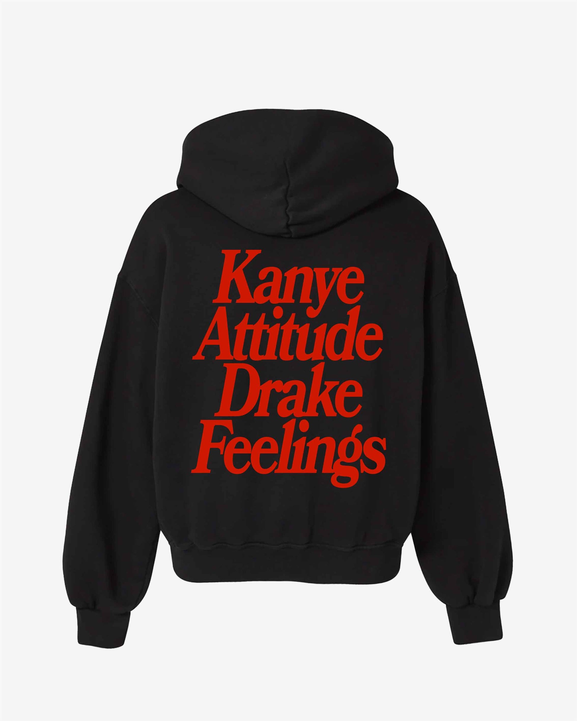 Two energies, one hoodie. This piece blends the unapologetic attitude of Kanye with the emotional depth of Drake, making it a wearable contradiction that just works. Bold red text on jet black fabric turns a cultural clash into a style statement.