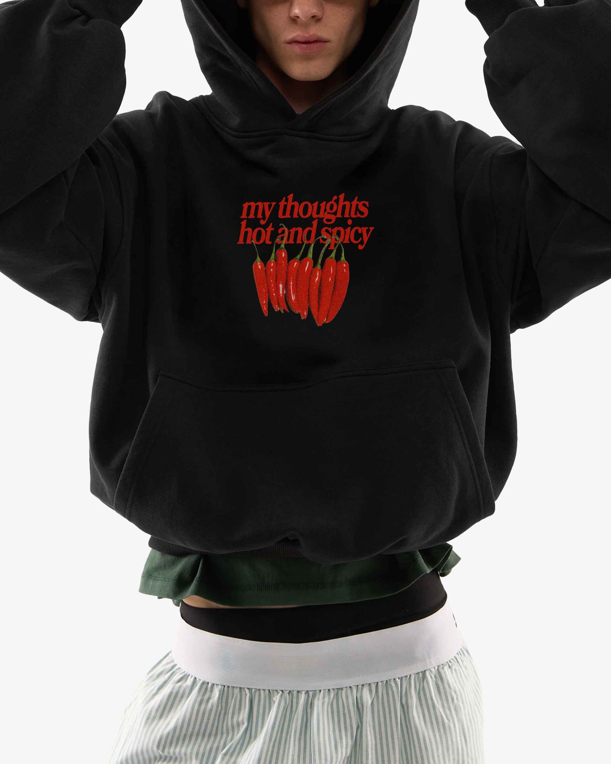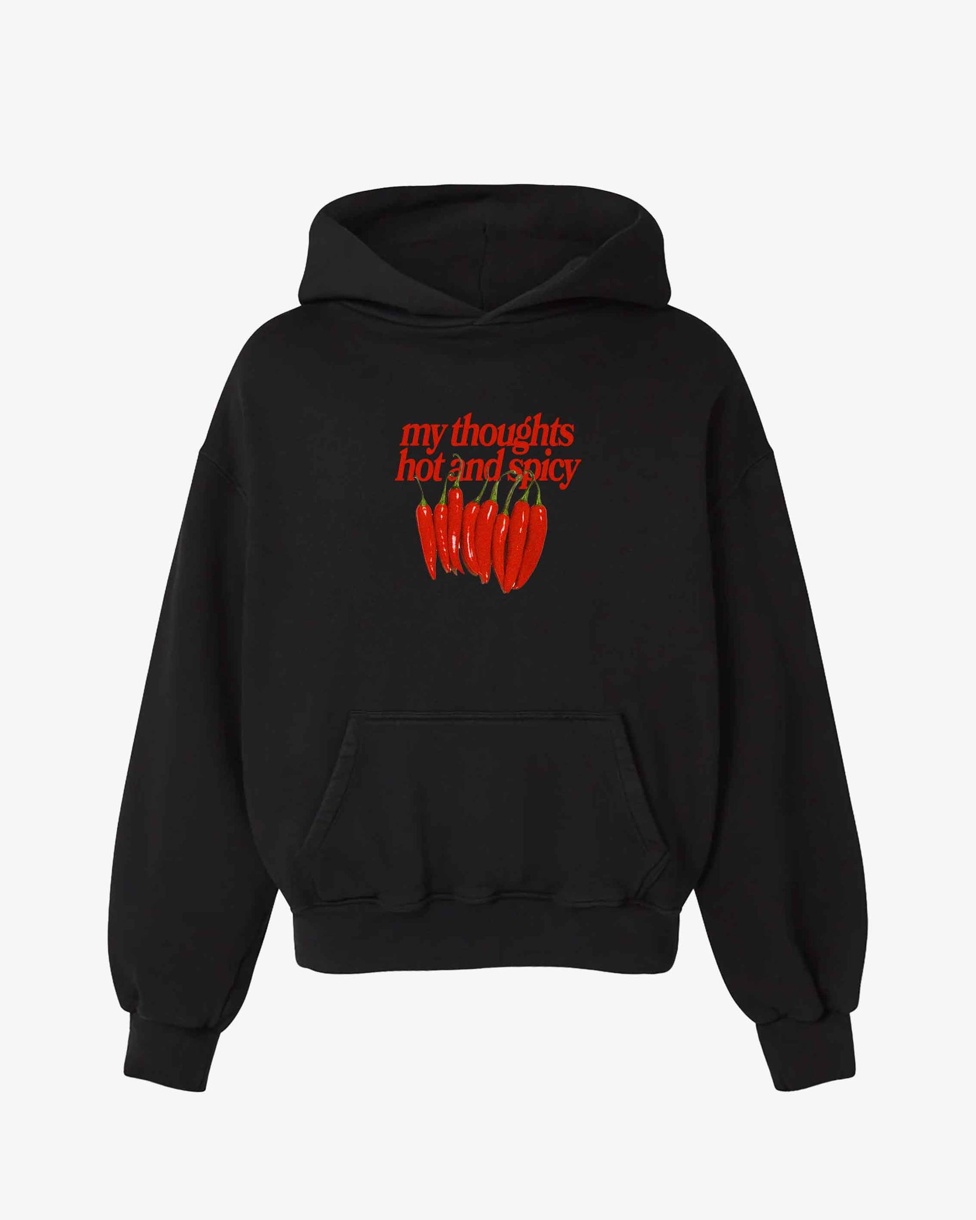 This cozy black hoodie brings the heat with a fiery pepper graphic and bold “my thoughts hot and spicy” front print. For those who don't just think out loud — they sizzle.