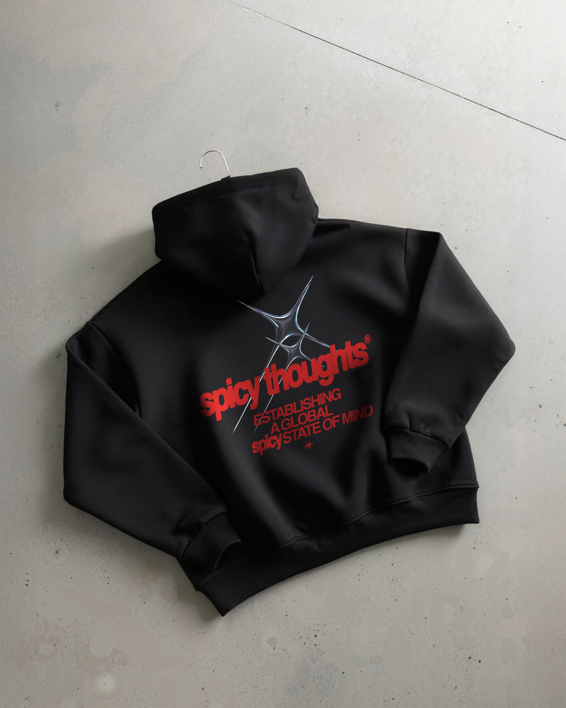 A bold, futuristic graphic paired with the iconic Spicy Thoughts typography creates a piece that feels like streetwear meets cult energy (the fun kind).