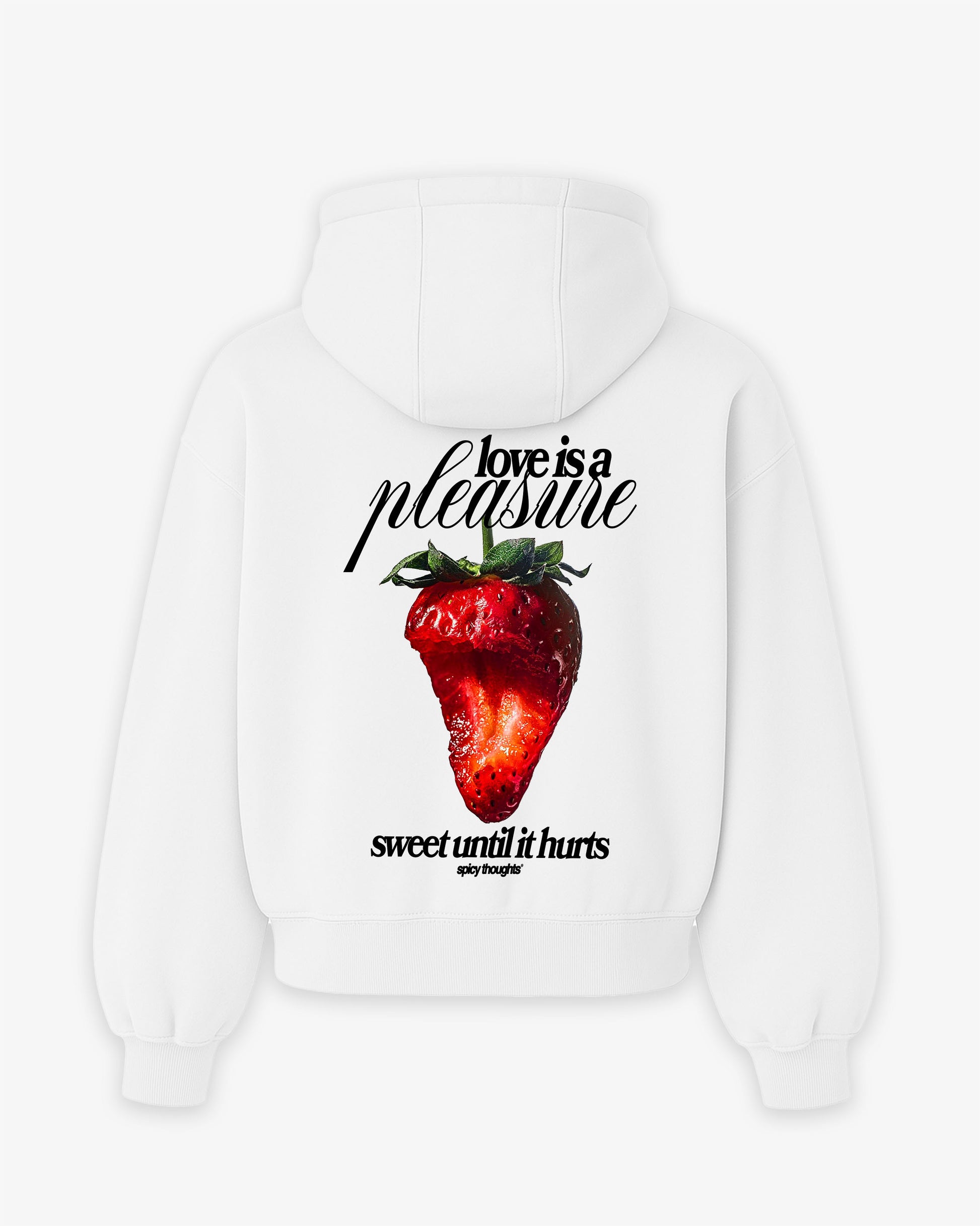 Der Love Is A Pleasure Hoodie von spicy thoughts® ist eine Hommage an bittersüße Emotionen – an Liebe, Verlangen und das Spiel zwischen Lust und Schmerz. Das realistische Strawberry-Motiv kombiniert mit elegantem Typedesign macht diesen Hoodie zu einem Statement über Genuss und Vergänglichkeit.