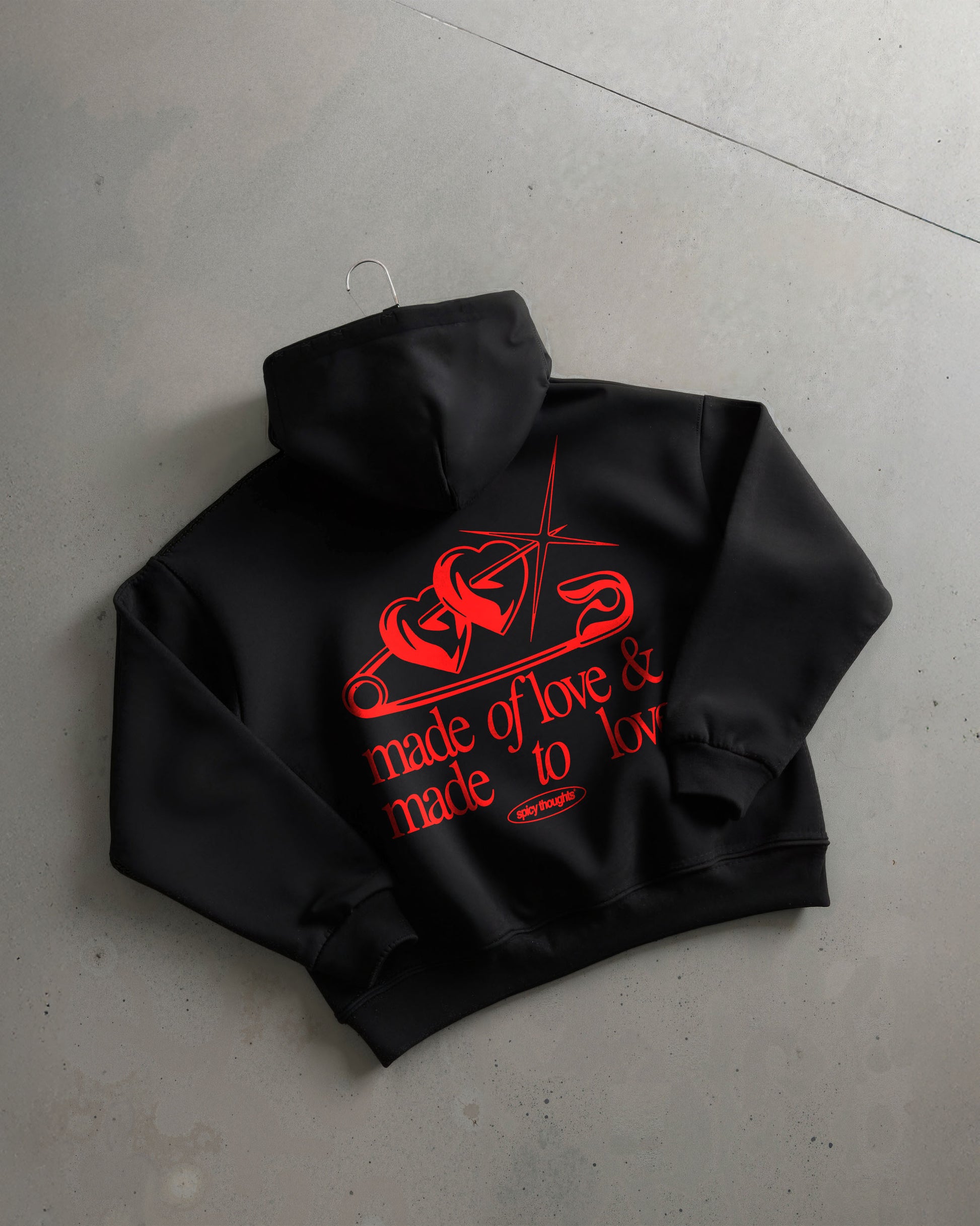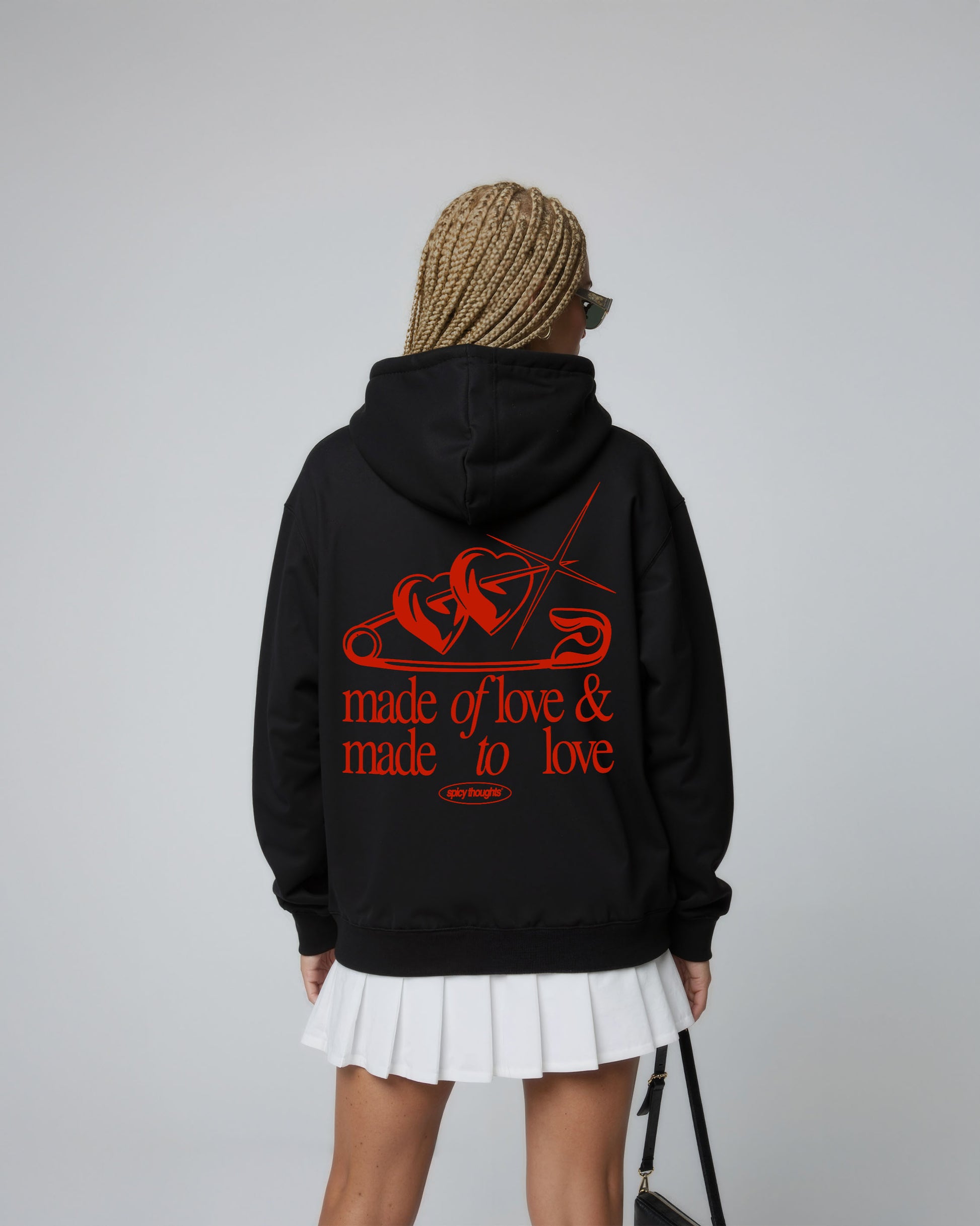 The “Made of Love & Made to Love” hoodie pairs emotional softness with a bold red graphic — featuring intertwined hearts, a safety pin motif, and a sparkling detail that gives major aesthetic energy.