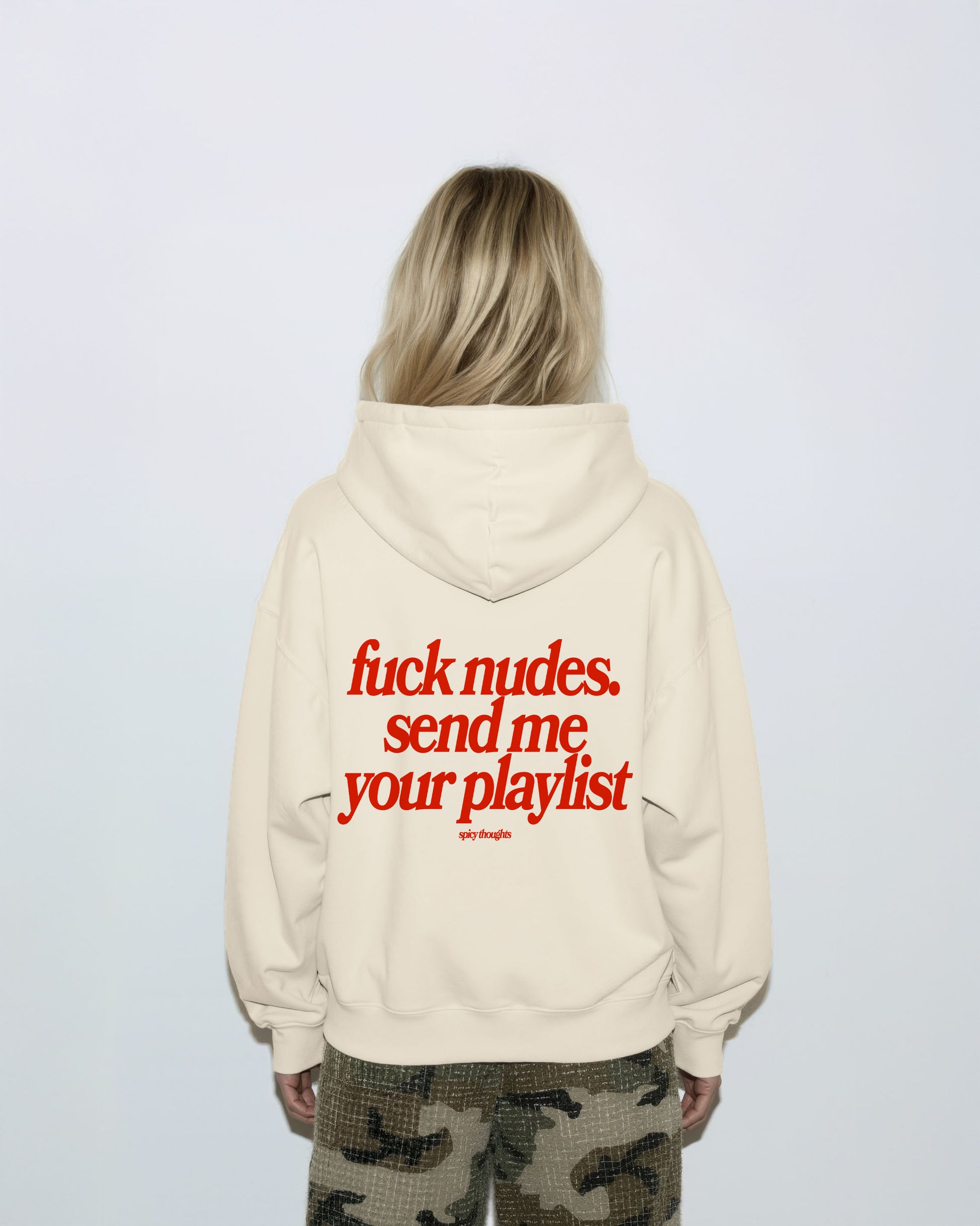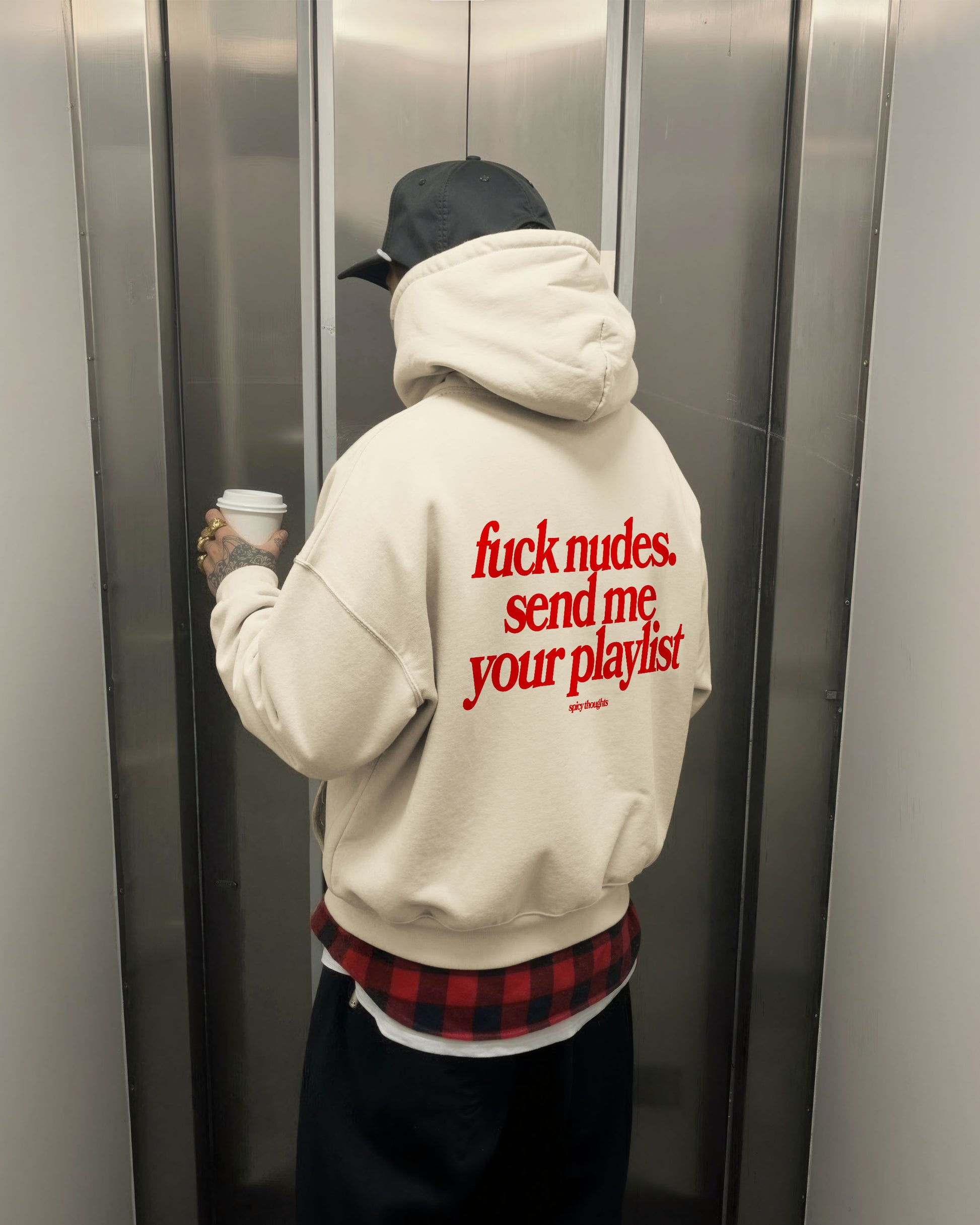 Not every vibe needs a photo. Sometimes, the real intimacy is hidden in the songs you love. This oversized hoodie says it straight: fuck nudes. send me your playlist.