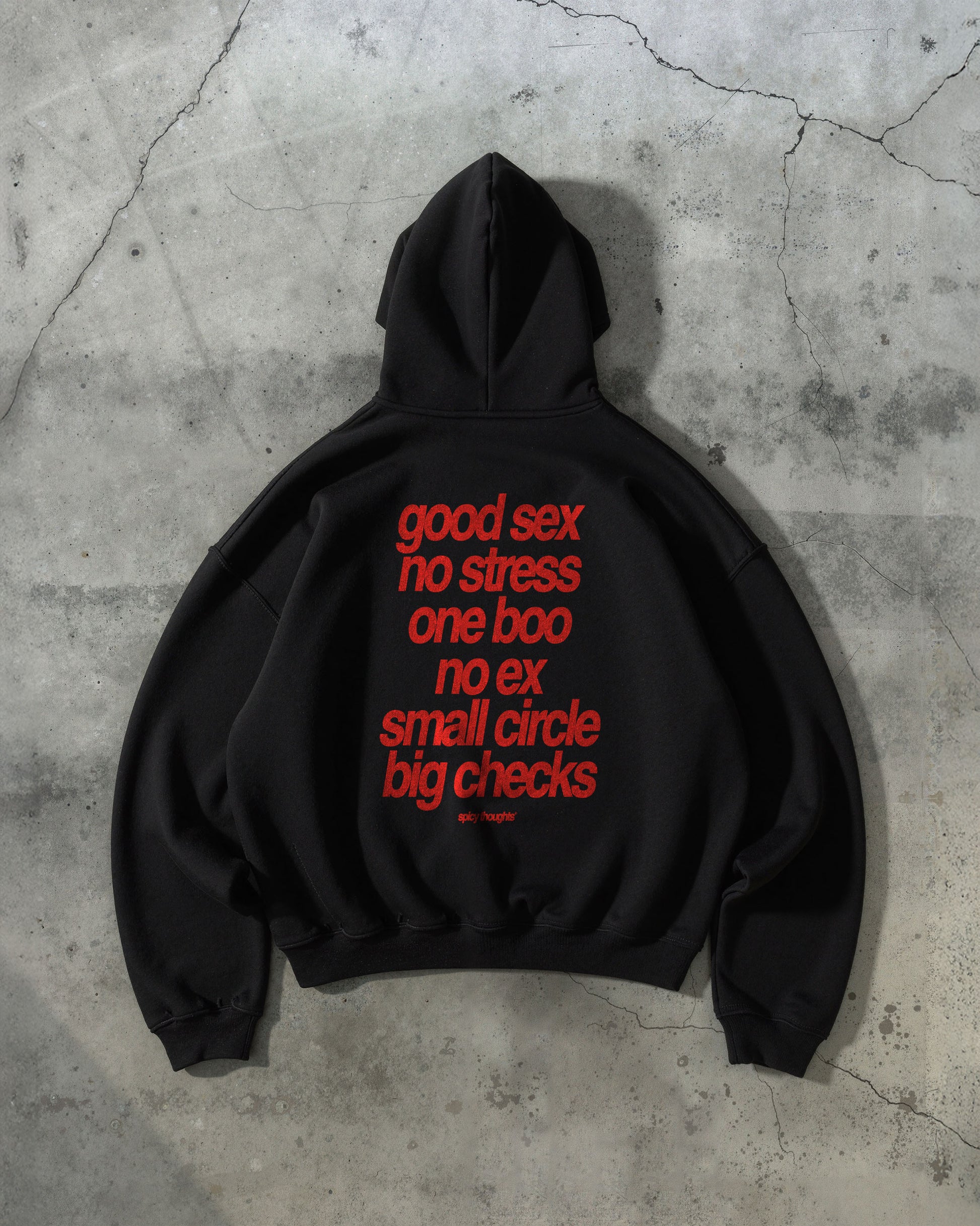 Keep it real, keep it simple. The “Small Circle Big Checks” oversized hoodie is all about low drama and high energy. Designed for those who value tight bonds, clear minds, and big goals, this hoodie brings effortless streetwear style with a bold red graphic on deep black.